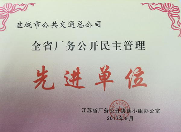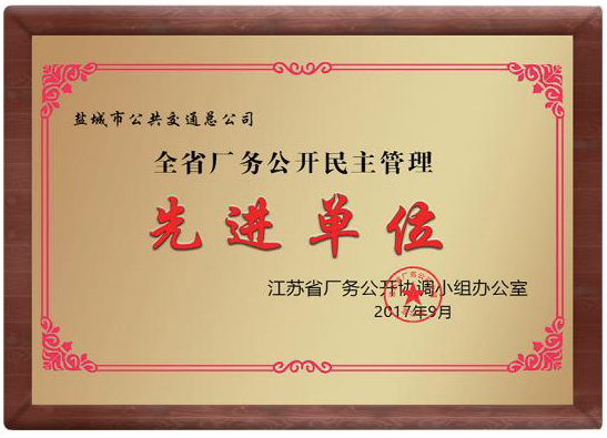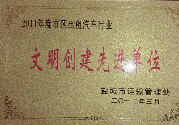 2022年4月公司被授予2021年度盐城市文明创建工作先进集体荣誉称号 2022年1月公司获评江苏省文明单位 2020年推动中国快速公交发展先进集体 全国交通运输文化建设优秀单位 推动中国快速公交发展先进集体 推动中国快速公交发展先进城市 全国文明交通示范单位 江苏省文明单位 盐城市文明单位 盐城市五一劳动奖 全省厂务公开民主管理先进单位 江苏省交通企业文化建设先进单位 全国交通运输行业文明示范窗口 盐城市民主管理示范基地 全省厂务公开民主管理先进单位 总公司团委荣获2016年度江苏省五四红旗团委荣誉称号 BRT车队-青年文明号 2018年全市道路运输行业驾驶员安全生产知识竞赛团体一等奖 公交出租公司被市运输管理处评为“2011年度文明创建先进单位” 被市交通运输局评为“2012年度全市交通运输系统交通服务品牌”