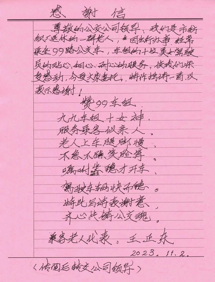 “九九车组十女神,服务乘客似亲人。老人上车腿脚慢,不急不躁笑脸等……”日前,市公交公司收到市纺织厂退休老人王正东寄来的一封信,信中老人赋诗一首表达了对99路巾帼示范线班组优质服务的感谢和夸赞之情。