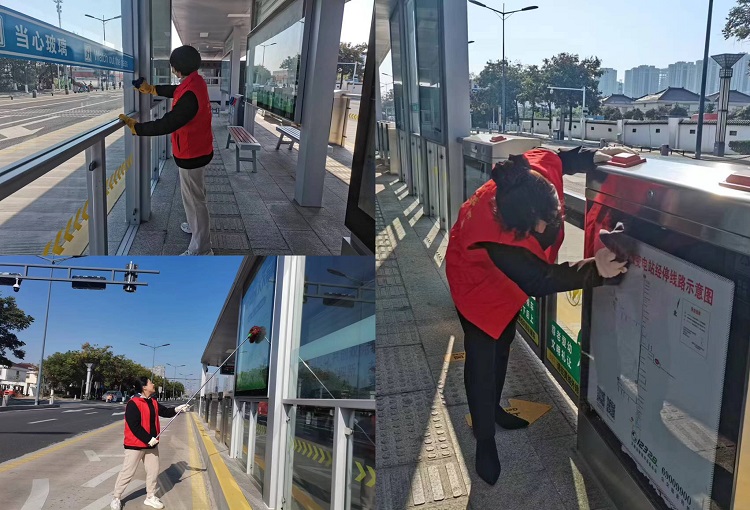 志愿者们来到开放大道,大家兵分两路,有的用抹布擦拭无人值守站台上的浮尘,开展清扫站台行动;有的投身于新墩社区文明交通宣传工作中去,征求对居民群众对公交营运服务的意见和建议,志愿服务活动如火如荼开展。