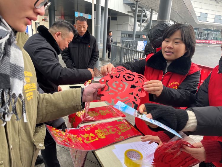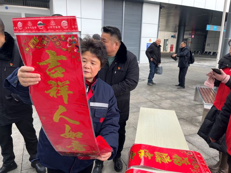 “送您一张福字,祝您新春快乐!”志愿者们还特意为乘客准备了手剪的窗花、新春“福”字、对联等,为广大市民乘客送上乘车惊喜,王女士收到对联和祝福后,脸上都洋溢着幸福的笑容。其他乘客见状,也纷纷上前来挑选,开开心心将幸福吉祥带回家,现场气氛热烈,好不热闹,喜迎新春佳节的仪式感和氛围感瞬间被拉满;同时,分公司广大干部职工积极为市民乘客提供导乘咨询服务,并收集群众的意见和建议,加以分析研究,为广大市民乘客送“福”、送“服务”。