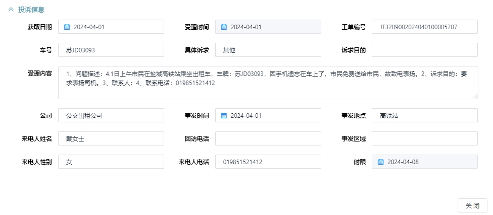 4月1日,市民戴女士拨打12345政务热线,感谢公交出租汽车驾驶员葛开峰师傅拾金不昧、乐于助人。