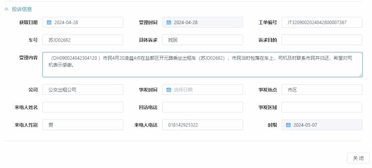 4月28日,公交出租汽车公司收到市民杨先生拨打12345政务热线表扬工单,感谢的哥孙华兴师傅拾金不昧、乐于助人。