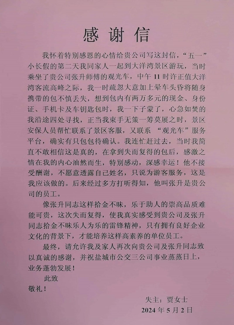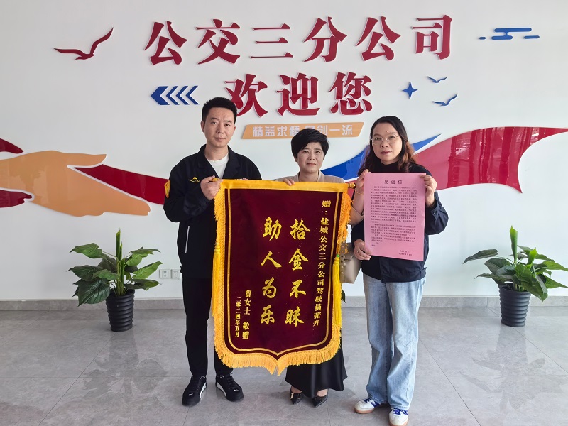 5月8日上午,市民贾女士专门驱车到市公交公司高铁站公交停车场,送来一面印有“拾金不昧 助人为乐”的锦旗和一封话语朴实但饱含真情的感谢信,当面感谢39路线路班长、驾驶员张升拾金不昧的善举,同时点赞培养出高素质优秀驾驶员的盐城公交。