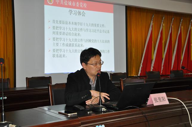 3月20日下午,盐城公交总公司邀请了中共盐城市委党校党史党建室主任张里阳副教授为我市司党员干部职工上了一堂以“十九大精神和新党章”为主题的专题党课。公司党委班子成员、机关全体党员及分公司部分党员代表参与了学习。