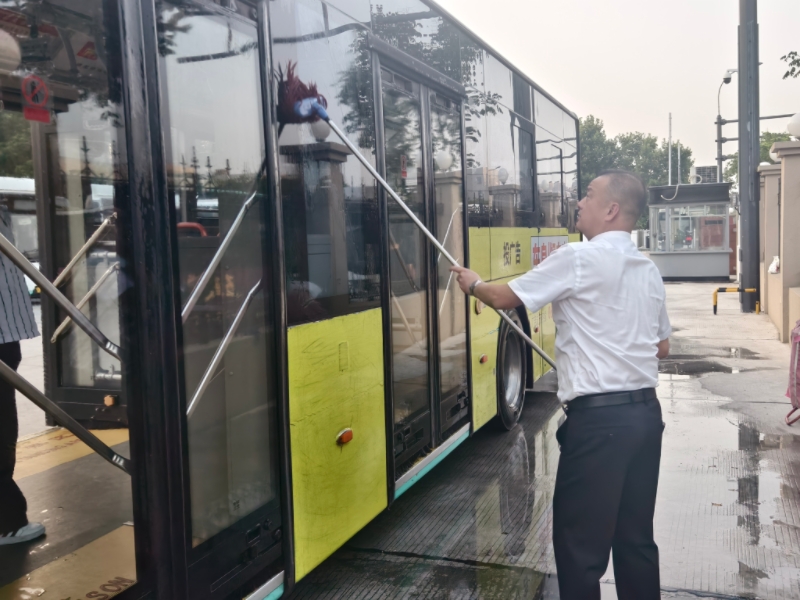 卫生清洁行动开始后,打扫人员迅速分组,携带清洁工具,登上了一辆辆即将投入运营的公交车。他们分工明确,有的负责车厢内部的清扫,从座椅、扶手到地板,每一个角落都不放过;有的则专注于车辆外部的清洁,用高压水枪冲洗车身,擦去灰尘与污渍,让公交车焕然一新。