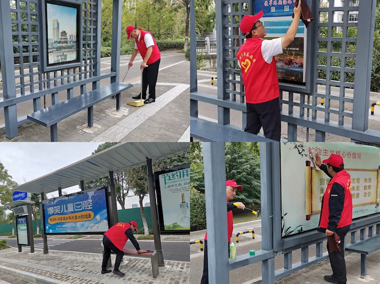 活动现场,志愿者们身穿红马甲,拎着水桶、拿着抹布、扫把、小铲刀、除胶剂等工具来到公交站台,认真细致地擦拭着站牌玻璃和金属边框、广告栏和等候椅,清理了站台附近的白色垃圾、纸屑等杂物,铲除附着在站台橱窗上的异物,以饱满的热情投入到站台的清洁劳动中,不怕脏、不怕累,团结协作,践行志愿服务精神、感悟劳动的幸福。