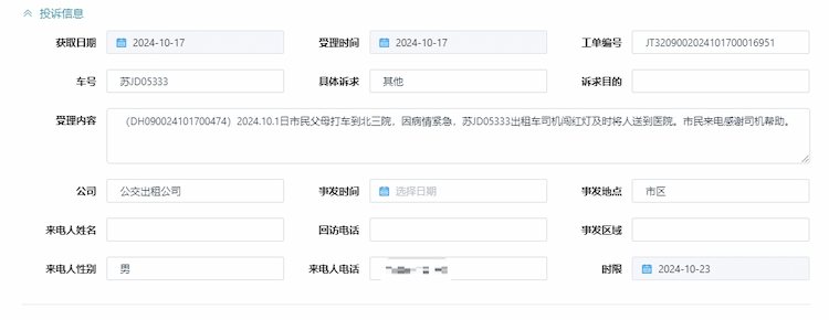 10月18日,出租汽车公司接到12345转来的表扬工单,市民顾先生感谢苏JD05333公交出租车驾驶员严海峰热心助人,为了护送市民父亲去医院急救,和时间赛跑,连闯2个红灯。