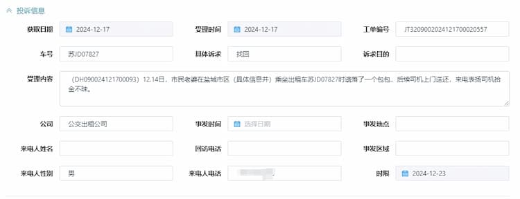 12月17日,出租汽车公司收到市民赵先生拨打12345政务热线表扬工单,感谢的姐袁海香拾金不昧、乐于助人。