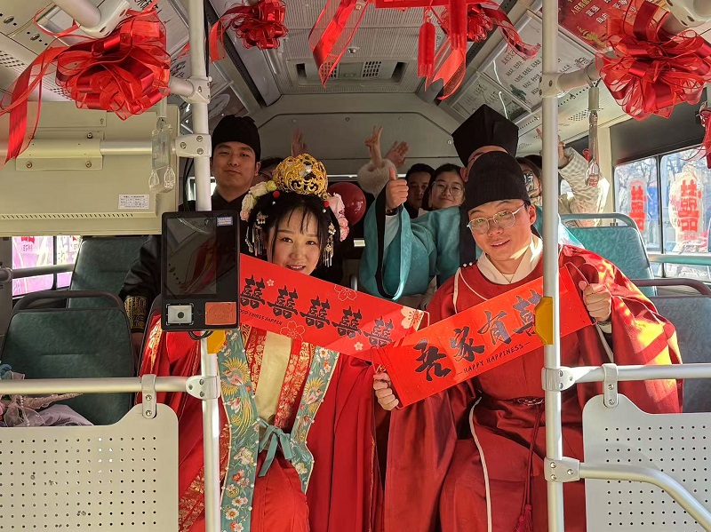2月7日上午,一辆贴着大红“囍”字,装扮着鲜花,由“琴瑟和鸣”开往“永结同心”的520线“公交婚车”载着帅气的新郎一路生花,迎接美丽的新娘。