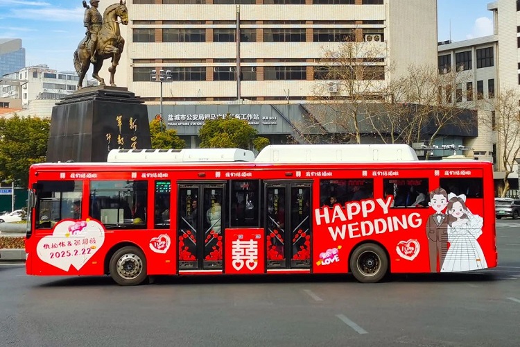 市公交公司为公交婚车的打造提供了全方位服务,从设计、制作到运营,每一个环节都展现了专业与用心。婚车由明日交投广告公司精心设计,将喜庆的红色与浪漫的粉色巧妙融合,车头醒目的“囍”字和车尾“百年好合”的祝福语,营造出浓厚的婚礼氛围。设计师从新人需求出发,结合公交车的独特造型,打造出既符合传统婚礼喜庆氛围又独具个性的婚车外观。