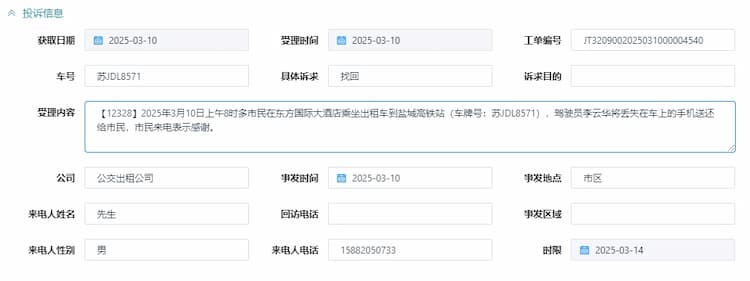 2025年3月10日上午8时许,公交出租汽车驾驶员李云华在盐城市东方国际大酒店搭载一名乘客前往盐城高铁站。乘客下车后,李师傅在例行检查车辆时发现后座有一部遗落的手机。他立即暂停营运,通过手机通讯录主动联系失主亲属,并驱车将手机送至高铁站归还失主。这一暖心举动让乘客深受感动,特致电12328盐城交通服务热线表达对李师傅的诚挚谢意。