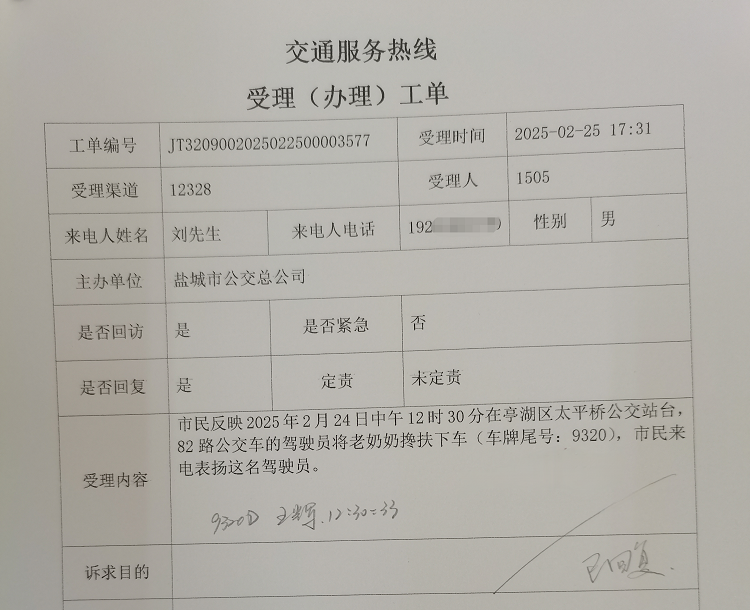 2月25日,二分公司收到了一则来自12328交通服务热线的表扬工单,对尾号为9320的82路公交车驾驶员热心搀扶老奶奶下车的行为给予了高度赞扬。