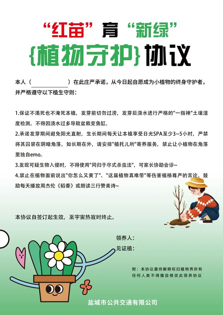 一株株小苗,承载着绿色的希望;一份份承诺,传递着环保的力量。通过此次生动有趣的植树节活动,盐城公交进一步宣扬公交绿色出行的重要意义,旨在引导小学生们从小树立环保意识,争做绿色发展的践行者和传播者。