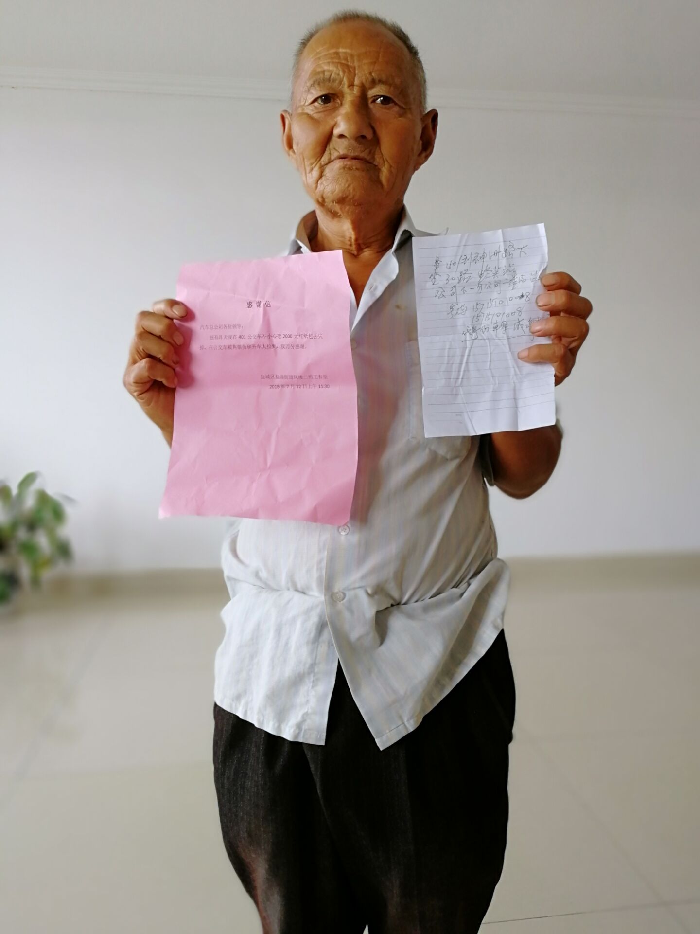 这位“客人”叫王春堂,是位古稀老人,22日中午在乘坐K401(苏J12578)时,不小心将身上的现金遗落在车上。该趟公交驾乘人员周其高、陈晓燕捡到后,积极联系公司帮助寻找失主,很快将失物归还给了老人。感动之余,王春堂老人写下感谢信,找到了盐城公交总公司,表达浓浓的感激之意。