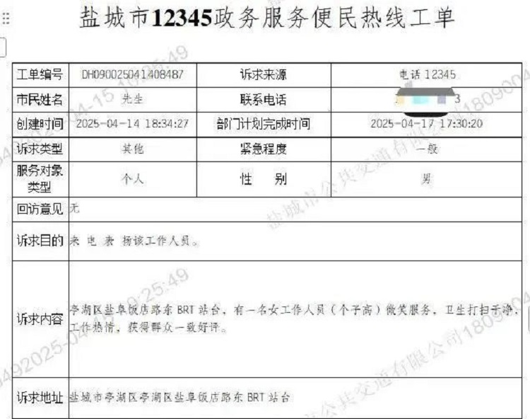 4月14日晚,亭湖区盐阜饭店东BRT站务员征明收到了一则市民表扬工单,工单中写道:“站台卫生干净整洁,工作人员热情周到”。作为站台“管家”,征明每天提前到岗,擦拭座椅、清扫死角,为老年乘客搬运行李;面对问询,她总是不厌其烦地解答,用真诚的微笑化解乘客的焦虑。十年如一日的坚守,让这座站台成了市民心中的“暖心驿站”。