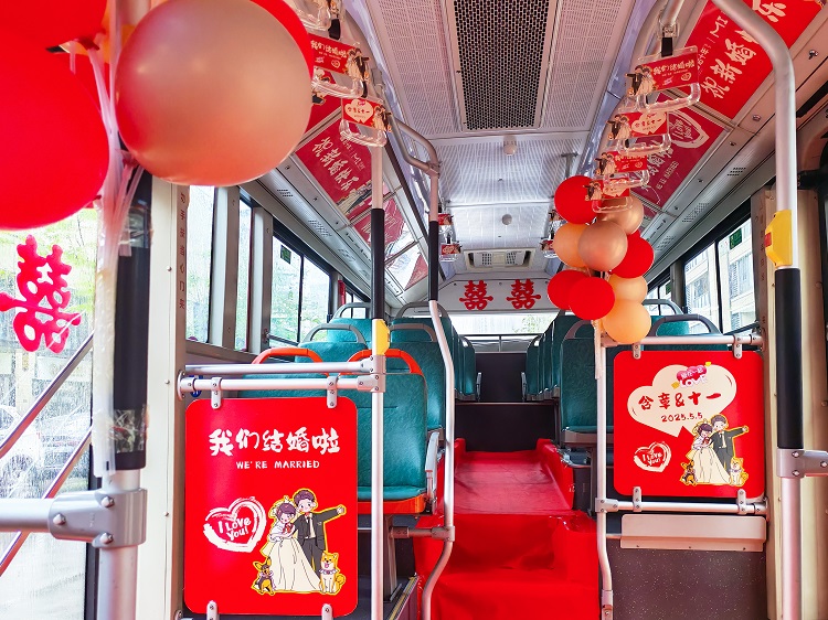 当天,一辆车身印有醒目“囍”字和新人姓名的红色公交婚车缓缓驶过城区。车头LED屏滚动播放由“琴瑟和鸣”开往“永结同心”的520专线字样,车窗贴满传统剪纸喜花,车内装饰了众多婚礼喜庆元素,营造出温馨浪漫的氛围。