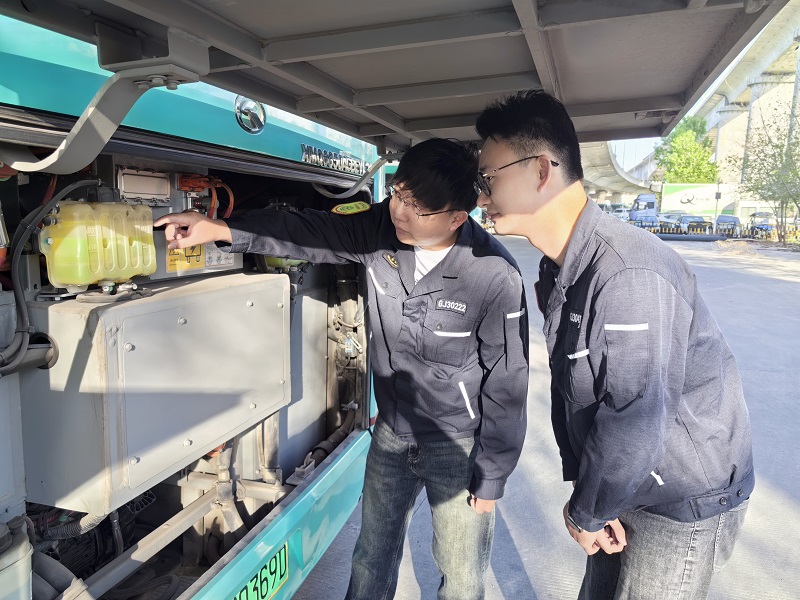 5月1日清晨,当第一缕阳光洒向大地时,师徒俩早早地来到华健物流园公交枢纽。在完成酒精检测、血压测量以及常规的班前叮嘱后,他们仔细地对车辆进行了例行检查,从刹车系统到轮胎气压,从灯光照明到车厢卫生,每一个细节都不放过,确保车辆以最佳状态投入运营。“入行第一天,我的师父就是这样教我的,一定要做好出车前的检查工作,这不仅是对乘客负责,更是对我们自己负责。”程杨再次向李江厦说道。