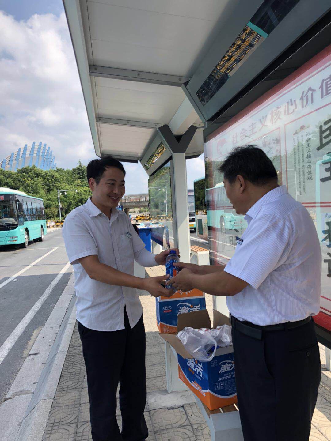 8月7日下午,公司党委书记、总经理王文法率领全体领导班子成员及中层干部,下基层、上线路、进车厢,开展“高温送清凉”活动。慰问组分成6个小组,分别到盐阜人民商场站台、城西回车场、五星客运站、BRT大庆路站、盐都车站公交站台、火车站回车场等场站开展送清凉活动,为酷暑下坚守岗位的驾乘人员送去防暑降温用品。