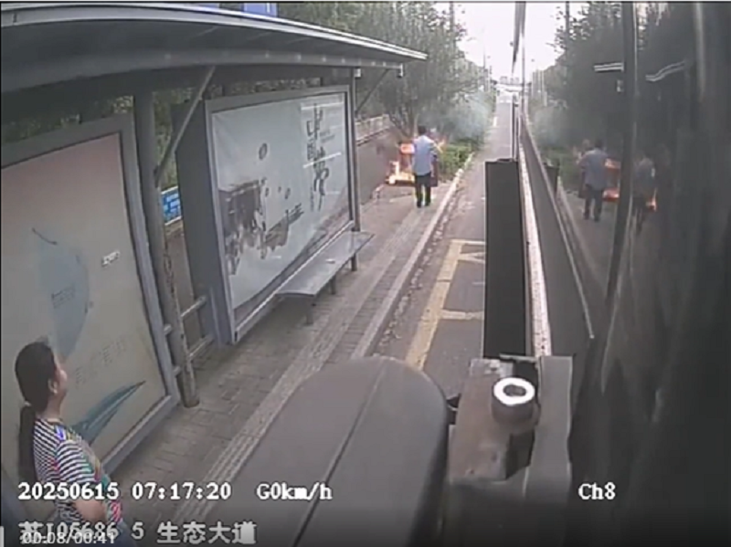 站台垃圾桶起火,公交驾驶员秒变“消防员”