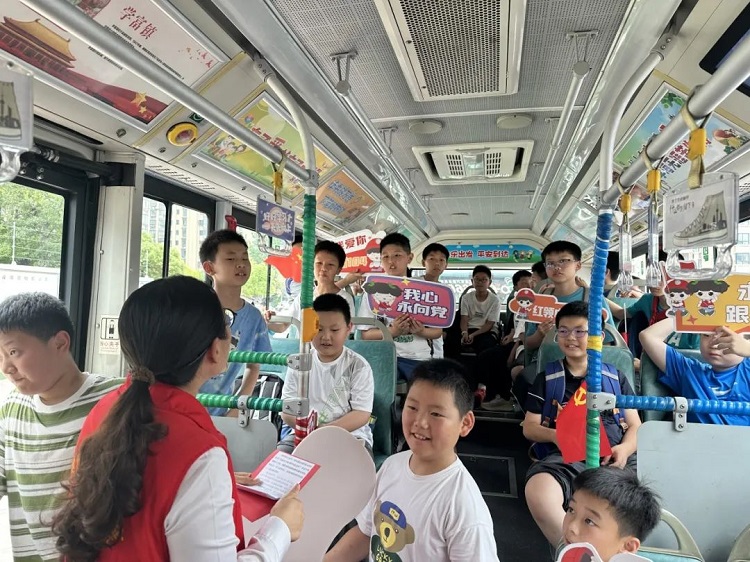 活动在温馨车厢中开启,行驶的校园定制公交化身红色阵地。党员代表作为讲故事的老师,为孩子们深情讲述“中国航天之父”钱学森毅然归国、科技报国的感人事迹。钱爷爷炽热的爱国情怀与无私奉献精神,深深打动了小听众们,大家眼中闪耀着敬佩光芒。