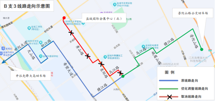 另:因西环路(蟒蛇河至双元路)道路施工,B支3线暂不停靠:金品花园、盐城艺术高中,文峰高级中学(市一院西)。