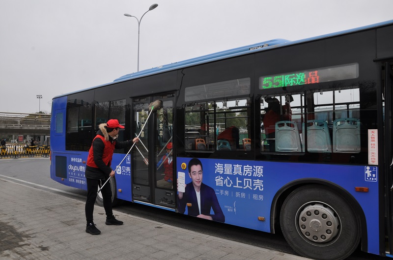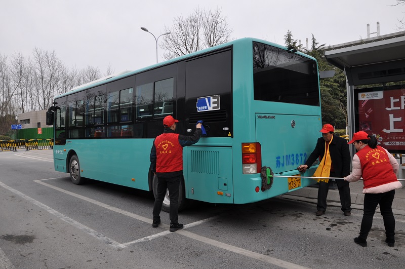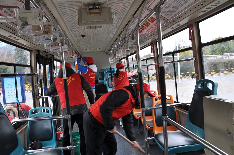 在火车站公交回车场和城西公交回车场,二、三分公司的公交志愿者们协助司乘人员对公交车厢、车身及候车亭进行清扫保洁,着力为乘客营造干净舒适的乘车、候车环境。