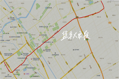 该条线路全长24.5公里,走向为:市公交中心回车场、西环路、世纪大道、226省道、环保科技城公交枢纽。沿途停靠:市公交中心回车场、西城逸品、盐都检测中心、西环路鹿鸣路口、金大洋、金太阳丰盛装饰城(下行)、丰盛金太阳装饰城(上行)、红星美凯龙、大世界装饰城、凤凰文化广场、高力国际家居港、市行政中心、金融城、世纪大道兴业路口、城东水厂(上行)、世纪大道新园路口、世纪大道天山路口(下行)、盐城师范学院、世纪大道希望大道口、世纪大道泰山路口、世纪大道黄山路口、世纪大道东环路口(上行)、市妇幼保健院东院(北门)、世纪大道华山路口(下行)、世纪大道五台山路口、世纪大道东山路口(上行)、世纪大道峨眉山路口、世纪大道崂山路口、世纪大道九华山路口(上行)、世纪大道沈海高速(西)、世纪大道凤翔路口、世纪大道民联五组、世纪大道民联六组、世纪大道民联九组、世纪大道226省道口、环保科技城公交枢纽。