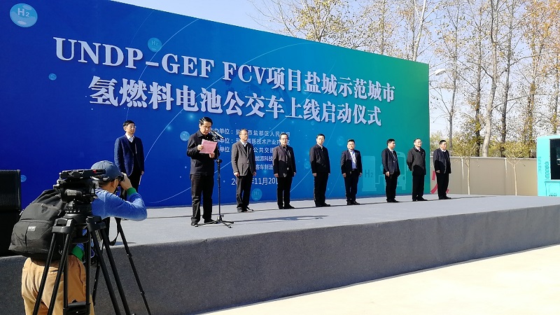 11月20日,氢燃料电池公交车上线启动仪式在盐城创咏加氢站公交回车场举行,市长曹路宝出席,并乘车体验。这是我市开通的首条氢能公交示范线路,首批投放10台车在K11线运营。