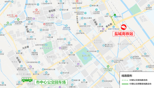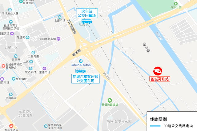 线路走向:盐城高铁站、青年路、范公路、大庆路、文港路、毓龙路、西环路、大庆路、文港路、青年路、盐城高铁站