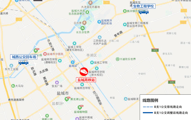 线路走向:市中心公交回车场、西环路、大庆路、盐马路、建军中路、文港路、青年路、范公路、盐城高铁站