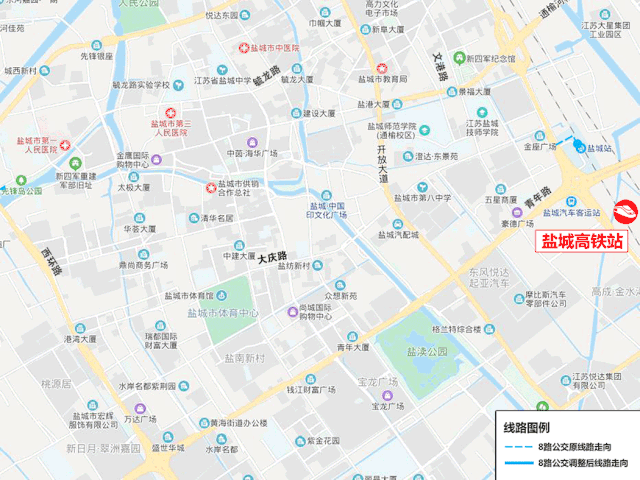 二、配合高架地面系统BRT环线的开通,2019年12月20日将新增公交B支8线(西环路南环路口——盐城高铁站)