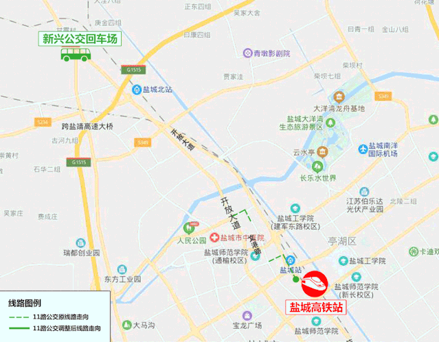 线路走向:新兴公交回车场、开放大道、黄海路、文港路、青年路、盐城高铁站