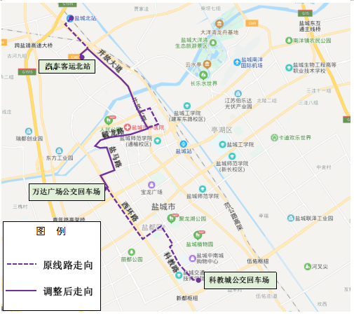 原走向:从盐城火车北站发车,途经开放大道、黄海路、文港路、毓龙路、建军西路、盐马路、大庆西路、西环路、新都路、盐城路、园中路,发往科教城公交回车场。调整后走向:从汽车客运北站发车、开放大道、黄海路、文港路、毓龙路、建军西路、盐马路、大庆西路、西环路,发往万达广场公交回车。