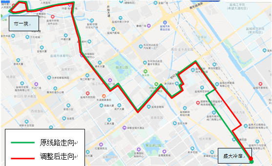 21路原走向:先锋国际广场、建军西路、毓龙路、小海路、建军路、迎宾路、东进路、人民路、世纪大道、开放大道、商业街、兴业路、新河路、世纪大道、新园路、新都路、文港路、盛大冷库,拟调整为:先锋国际广场、建军西路、毓龙路、小海路、建军路、迎宾路、东进路、人民路、世纪大道、开放大道、商业街、兴业路、新河路、世纪大道、新园路、盐渎路、文港路、盛大冷库。
