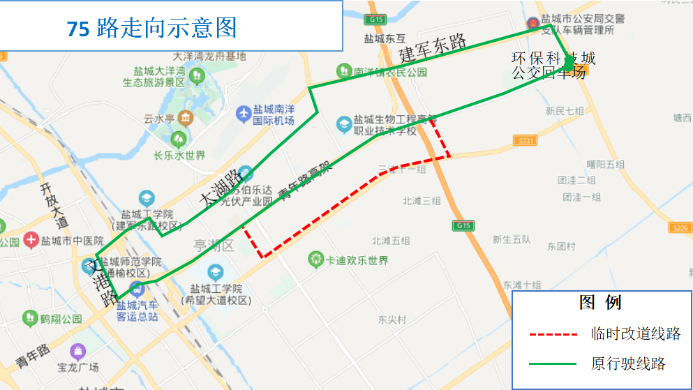 75路线路走向:环保科技城公交回车场、环保大道、青年东路、文港路、太湖路、青墩连接线、建军东路、S226、环保科技城公交回车场。