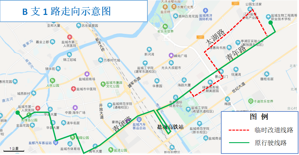 B支1线路走向:西环路、毓龙路、建军西路、盐马路、大庆路、解放路、青年路、运河路、青年路、生物工程学校。