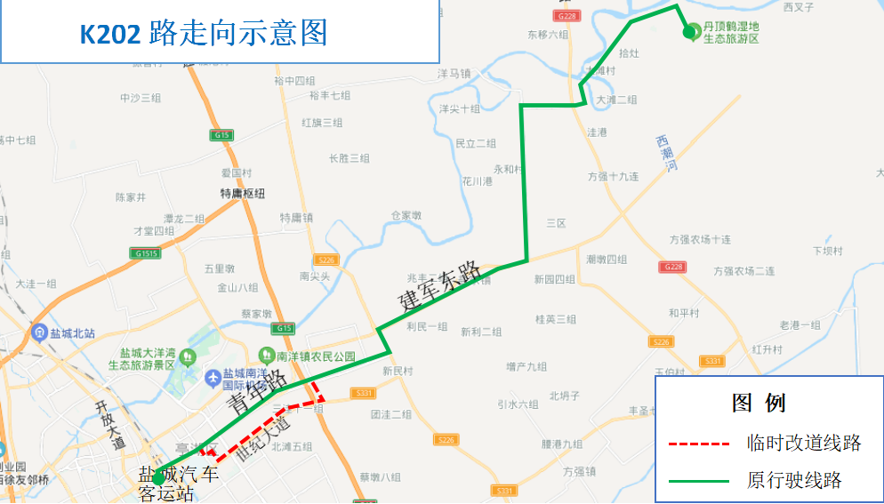 K202线路走向:盐城汽车客运站回车场、青年路、环保大道、S226、建军东路、盐东镇集镇路、黄新线、丹鹤路。