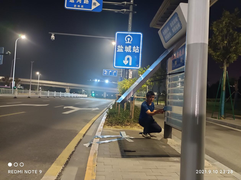 近期,盐城市旅游集散中心将整体搬迁到高铁站枢纽内,配合搬迁,亟需对市区所有经停高铁站西广场的公交线路沿线公交站台增加“盐城市旅游集散中心”站牌标识。由于时间紧、任务重、施工范围广,接到任务后,修理公司迅速部署,组织突击队加班加点、放弃休息时间,仅用3天时间便完成了近300座站台站牌标识更换任务。