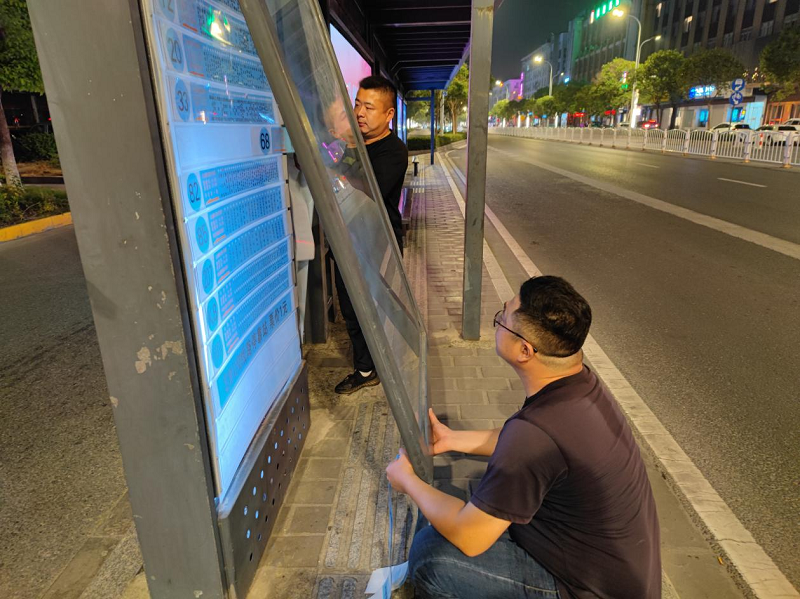 为保证工作效率,提高职工工作积极性,修理分公司负责同志始终坚守在施工一线,靠前指挥,与突击小组干在一起,统筹推进城南、城北、城东、城西四条线同步施工,以“一换一销”的方式,对25条相关公交线路,近300余块灯箱站牌标识进行了更换,为有序营运、服务出行提供了保障。