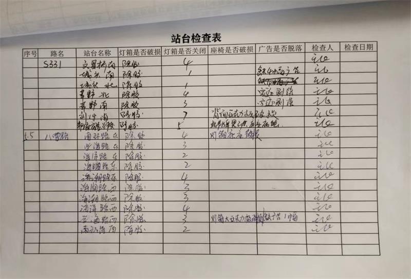 工作人员按道路、编号对大市区公交站台逐个安装编码牌并同步填写站台检查登记表,为建立并完善场站公司站台资产电子台账提供准确的信息支撑。