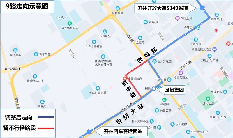 因鹿鸣路(西环路至镇中路路段)道路封闭施工,自2022年6月30日起公交9路实行临时改道行驶,具体如下: