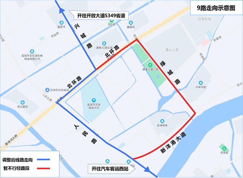 因绿城路(北环路至新洋港大道)道路施工,7月12日起,公交9路临时改道行驶,具体如下:
