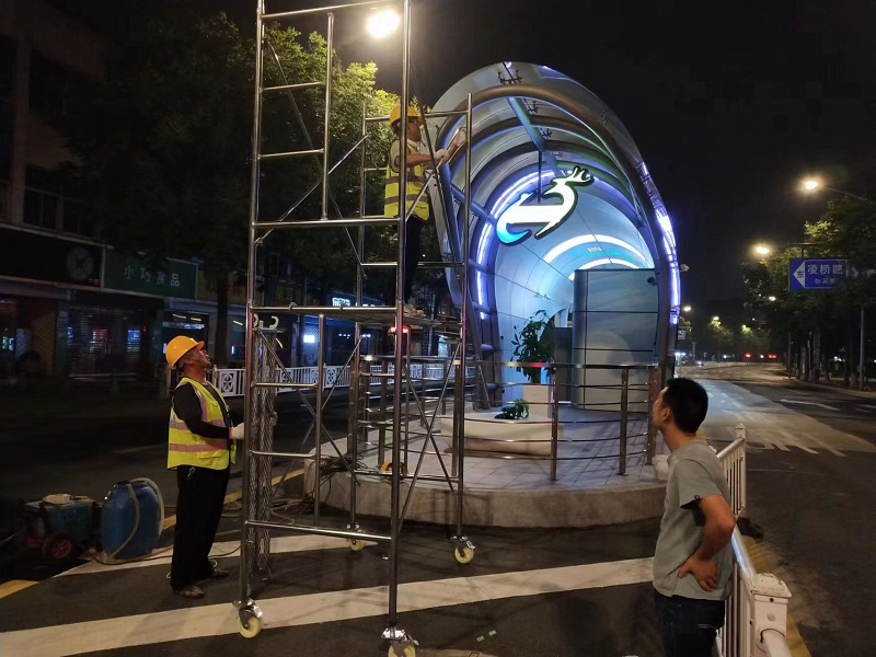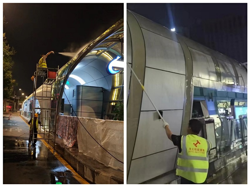 为最大程度降低清洗作业对道路交通秩序的影响,工作人员抢抓夜间人少、车少的有利时机进行站台清洗。工作人员首先采用高压水枪对站台的顶棚、立柱等显露位置进行全方位冲洗,然后用蘸着专用洗涤剂的刷子,自上而下认真擦拭,不放过每一个细节,最后用清水冲洗干净,用毛巾擦除水迹,再冲洗掉路面上的尘垢。经过清洗后的站台焕然一新,靓丽如初。
