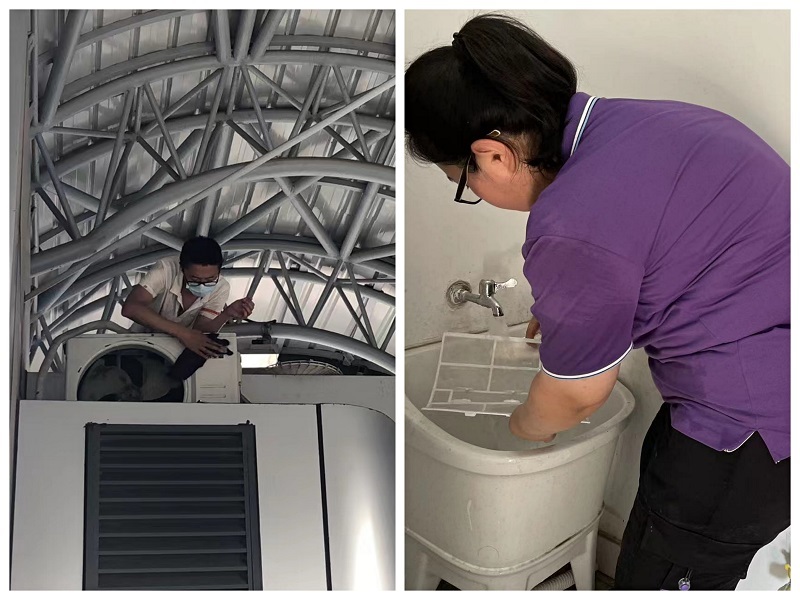 为保证清洗效果,公司聘请了专业保洁人员进行空调清洗作业。保洁人员利用伸缩梯爬上站房顶部,使用清洗剂对空调外壳、冷凝器、风扇、滤网、面板等重点部位进行彻底清洁保养,达到了消毒杀菌、增强制冷、降低电耗的效果,提高设备的使用寿命。
