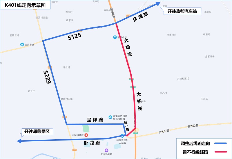 因盐都区大杨线(S125至纬二路路段)封闭施工,自2022年8月16日起,公交K401线路临时改道行驶,具体如下: