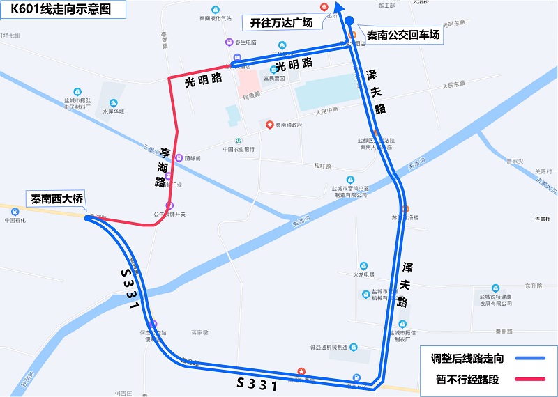 另因盐都区秦南镇境内亭湖路(光明路至秦南西大桥)路段封闭施工,自2022年8月17日起,公交K601线路临时改道行驶,具体如下: