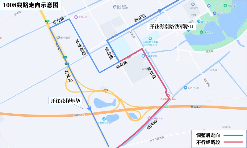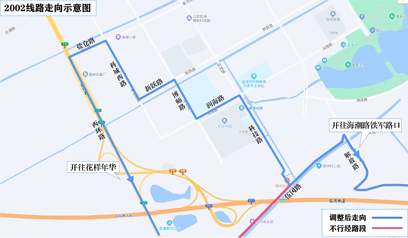 调整后走向:花样年华、龙园道、西环路、盐仓路、科城西路、新跃路、博师路、润海路、科技路、伍冈路、解放路、园博路、人民路、新盐路、珠溪路、创业路、康居路、新盐路、人民南路、华师路、康居路、步湖路、人民路、海潮路、海潮路铁军路口。