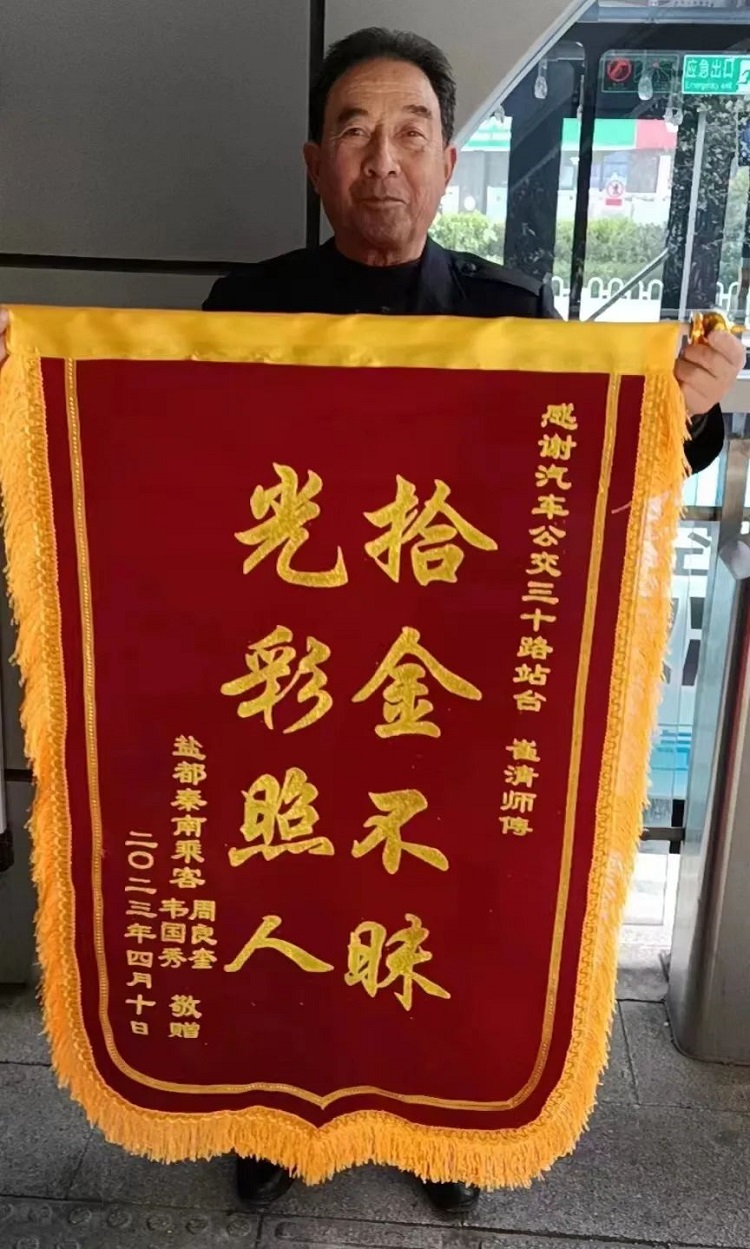 4月15日上午,周老先生特意携带一面印着“拾金不昧,光彩照人”的锦旗来到30路公交车终点站,表达了对崔清师傅和公交公司的感激之情。