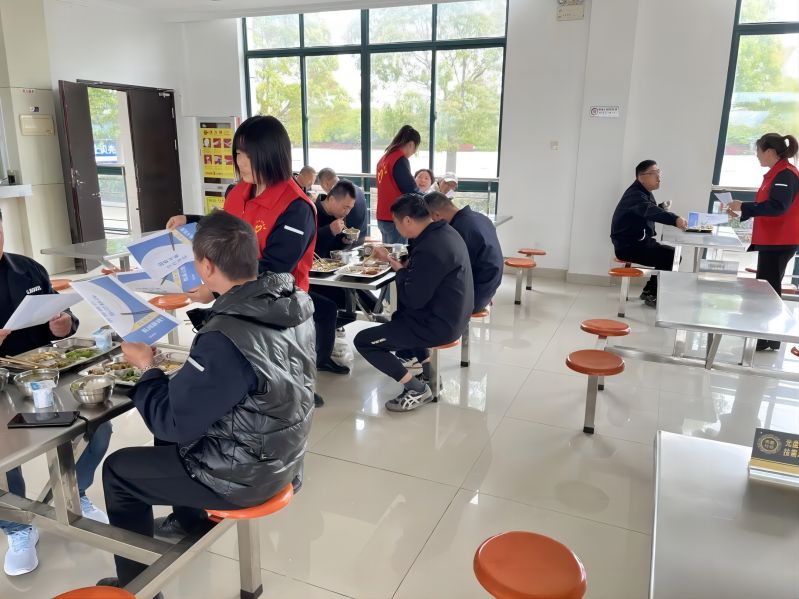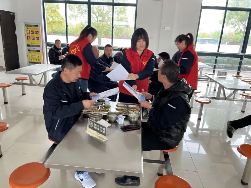 在职工食堂,工作人员向就餐职工发放倡议书,倡导养成科学饮食、节约粮食的好习惯,“让光盘成为习惯,将节俭变成自然”,以“小餐桌”带动“大文明”。