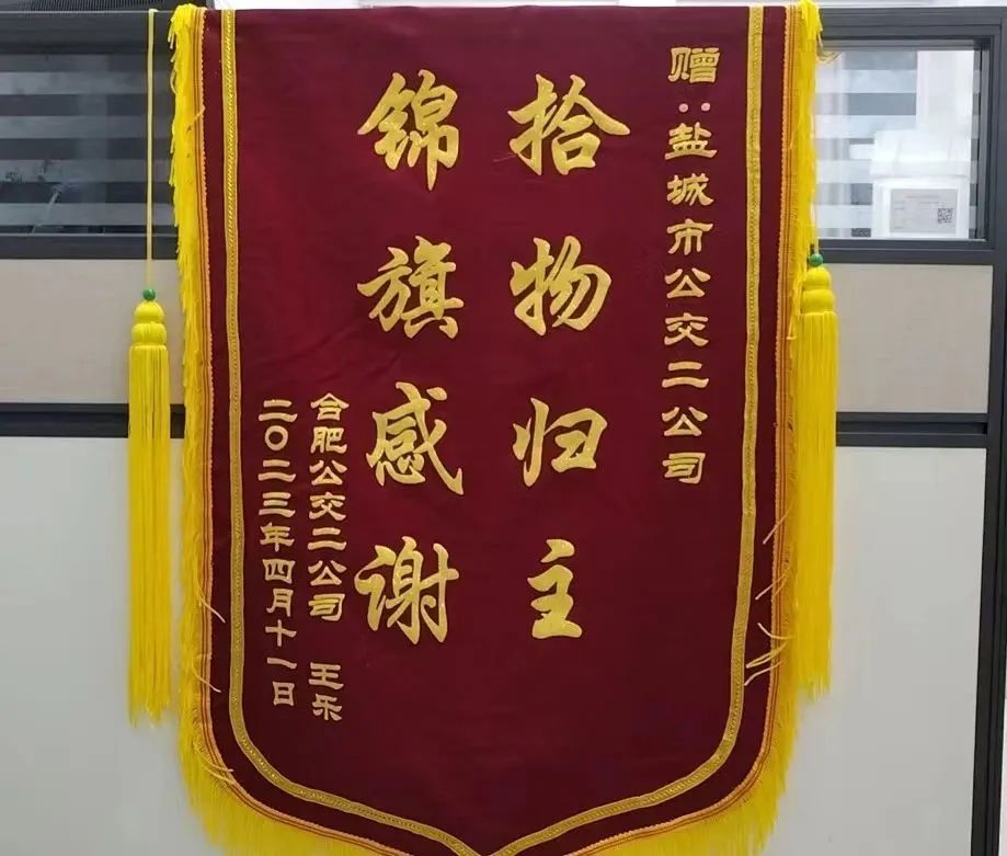 王女士深深地被盐城公交人的热情帮助所感动,回到合肥后,她第一时间制作了一面锦旗邮寄到盐城公交二公司,以此表达感激之情!